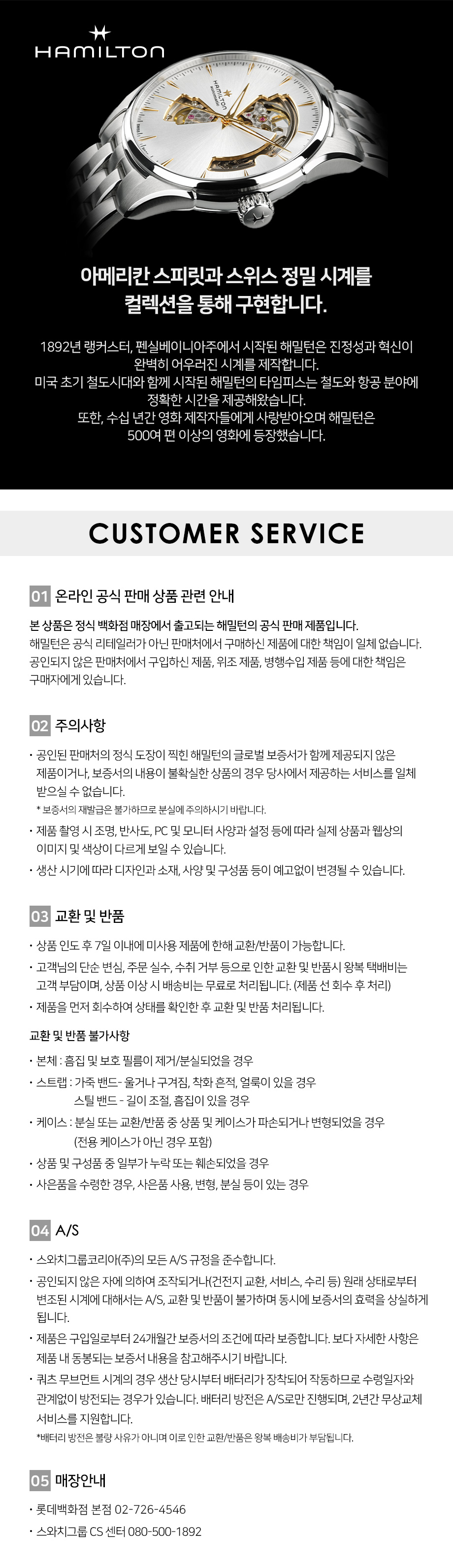 | 품질보증기준 | 관련법 및 소비자 분쟁해결 기준에 따름 | A/S 책임자와 전화번호 | 해밀턴//스와치그룹CS센터 02-3149-9555 |